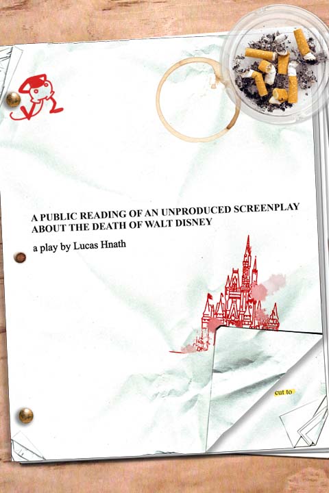 Tonight, aided by a pack of cigarettes, a bottle of vodka, three actors and a pile of dead lemmings, Walt Disney will read you a screenplay he wrote about his final days on earth.